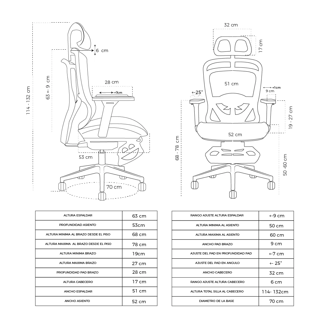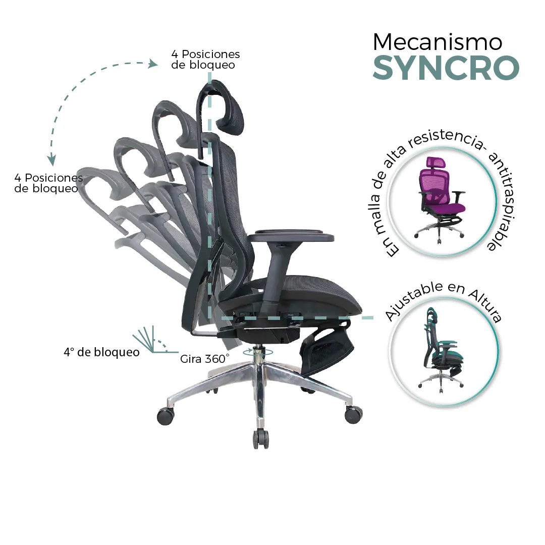 | Espaldar | Malla plástica alta resistencia +Graduable en altura y profundidad |